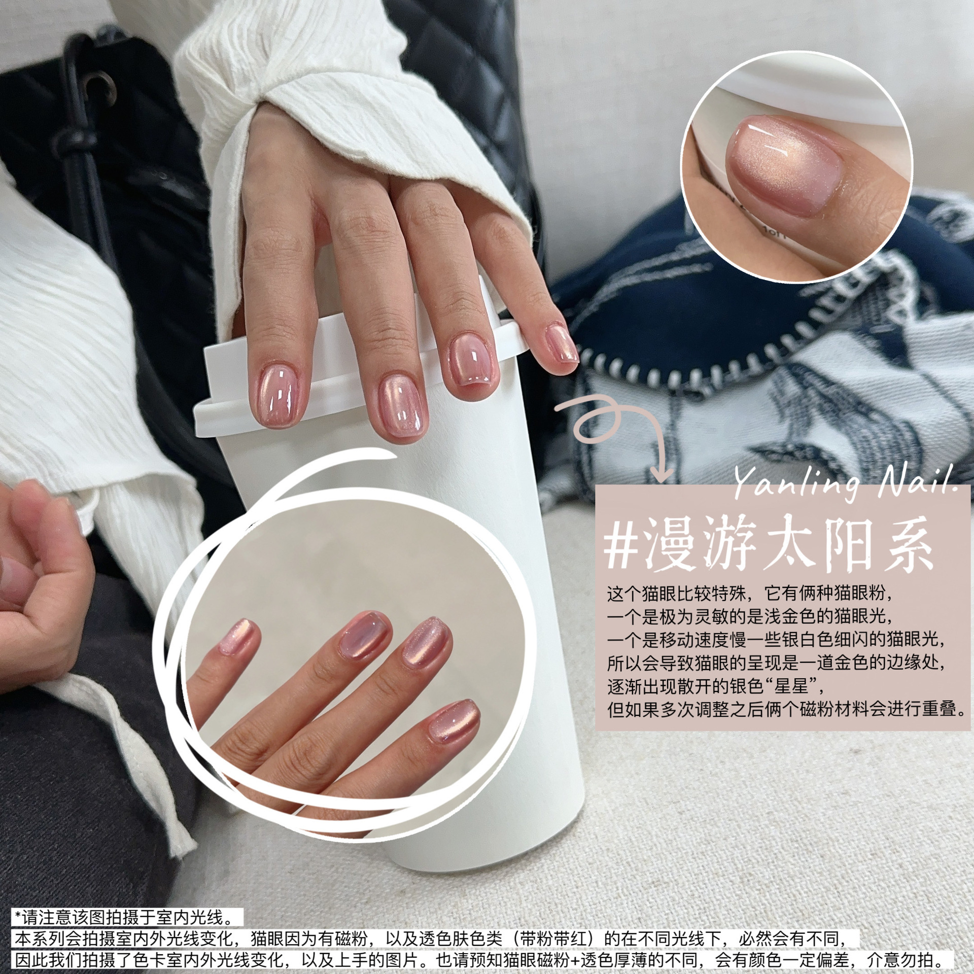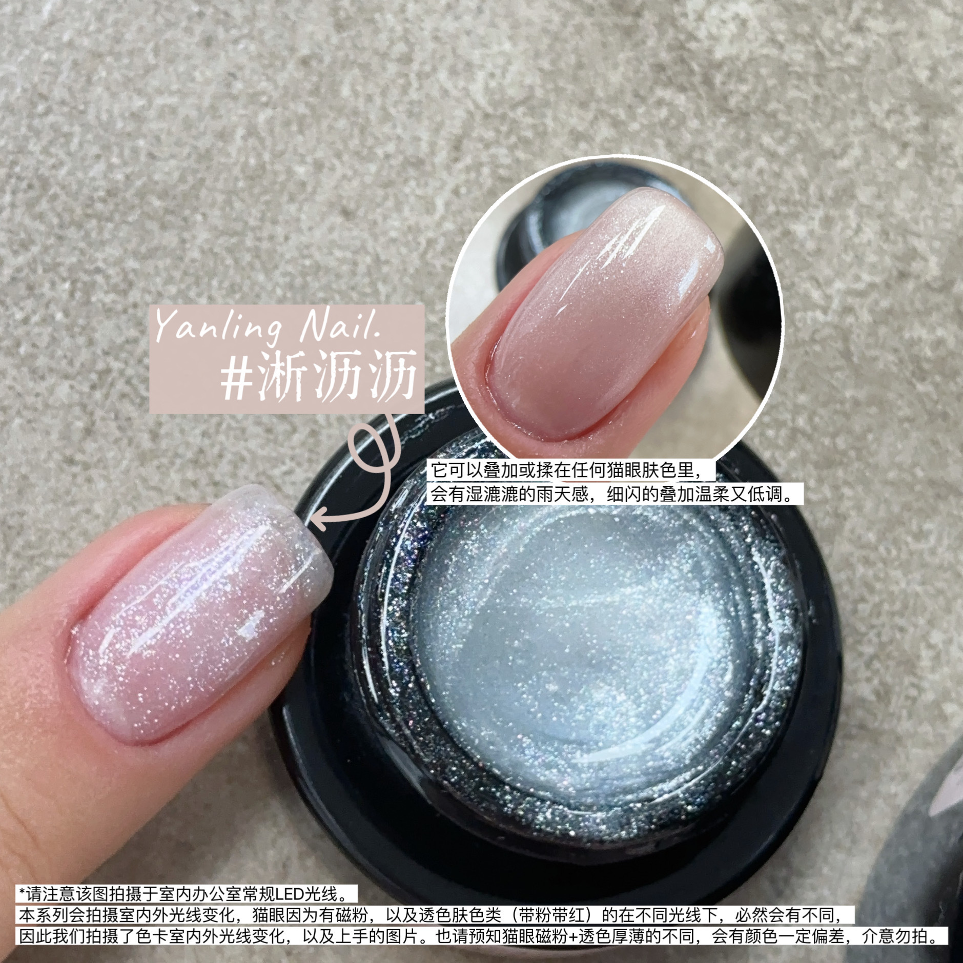 - Yanling Cat's Eye Polish is a high-quality nail polish that comes in a 5g jar. It is part of the Rain Before series and features a range of 7 colors. The polish is known for its fine, watery shine that resembles Japanese cat's eye nail polish with a nude glass bead effect. The product is sensitive to light and may appear different under various lighting conditions. It is advised that the color may vary depending on the thickness of the application and the user's natural nail bed color. Some colors contain fluorescent pigments for brightening effects, but they are not harmful. The polish is sold without a brush, which needs to be purchased separately. It is recommended to apply a thin layer for a natural, skin-like effect. Two special colors include a dual magnetic cat's eye and a shimmering material that can be mixed with any cat's eye polish for a rainy, wet look.