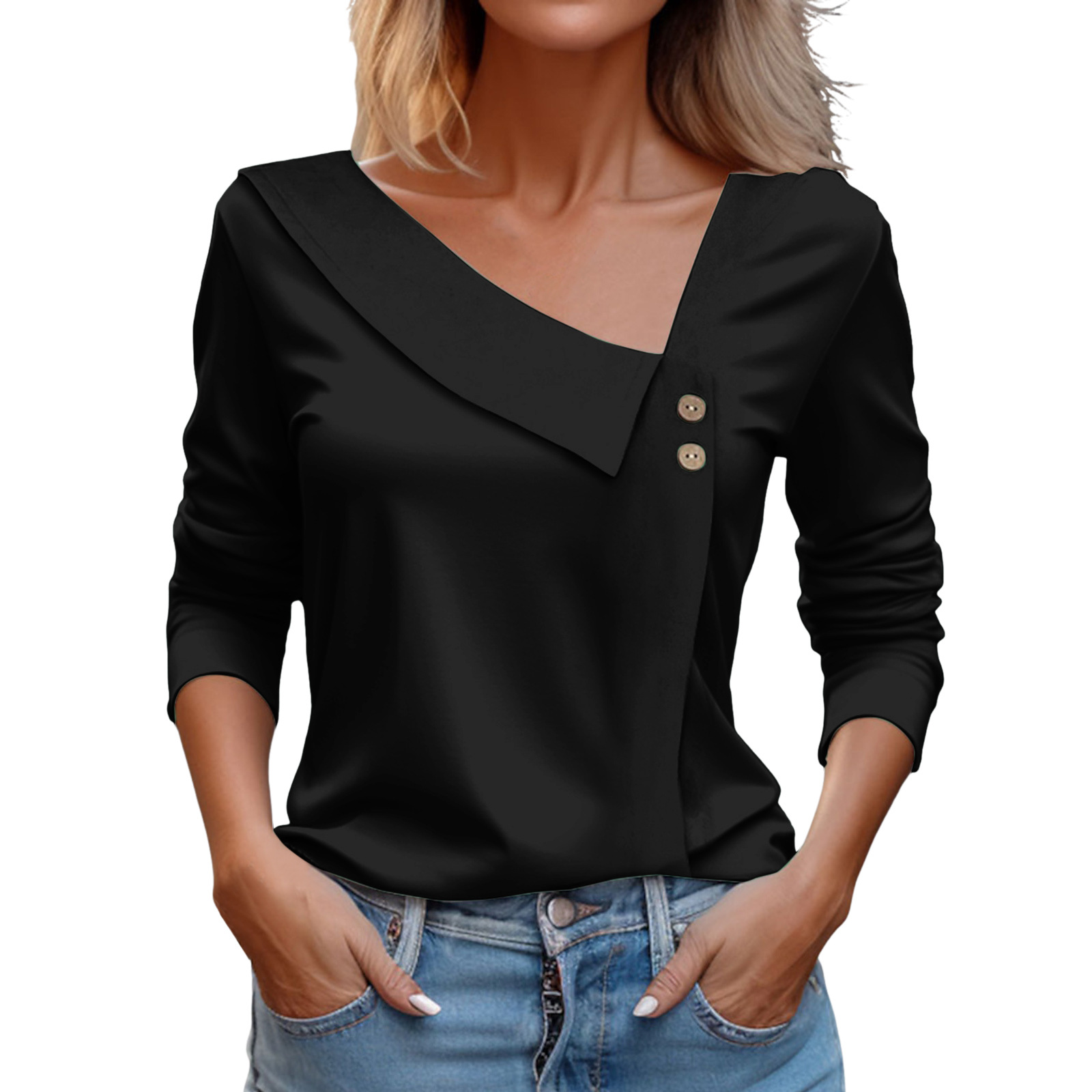 V-Neck Button-Trimmed Long Sleeve Casual Pullover T-Shirt